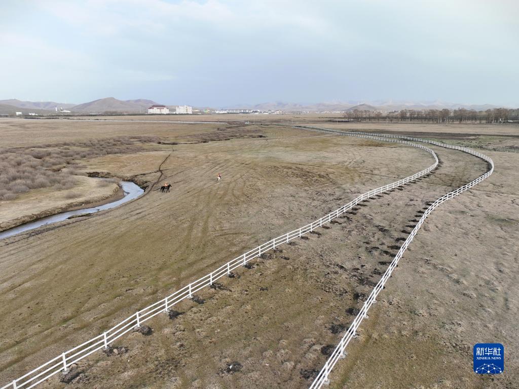 5月2日,河北省承德市豐寧滿族自治縣大灘鎮扎拉營村的護林員在海留圖國家濕地公園巡邏(無人機照片)。