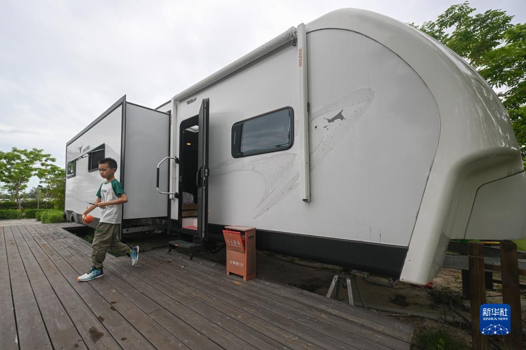 5月1日,游客在海南花梨谷文化旅游區房車庭院玩耍(無人機照片)。
