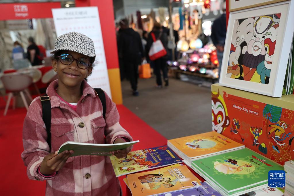 5月2日,在法國巴黎凡爾賽門展覽中心舉辦的巴黎博覽會上,兒童在“遇·鑒中國——中華文化主題展”上閱讀“美猴王”系列英文版圖書。