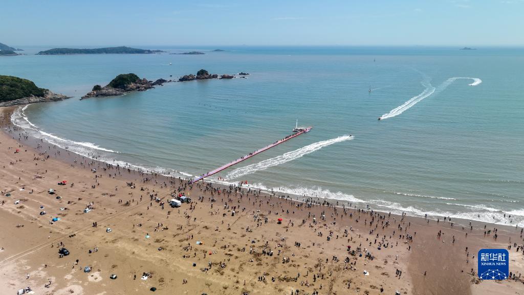 5月2日,游客在浙江省舟山市朱家尖大青山里沙景區游玩(無人機照片)。