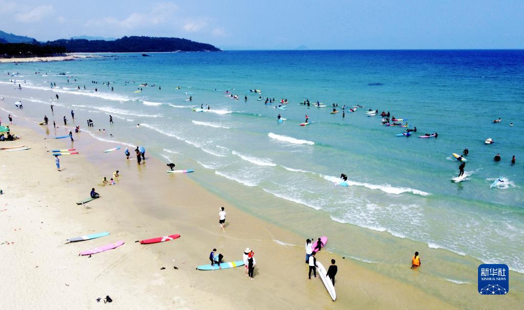 5月1日,游客在海南省萬寧市日月灣國家沖浪基地沖浪、休閑(無人機照片)。