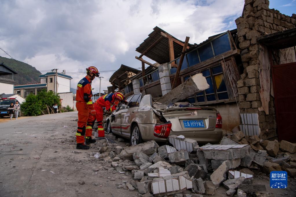 5月3日,應急救援人員在云南省保山市隆陽區瓦窯鎮排查受損的房屋和車輛。