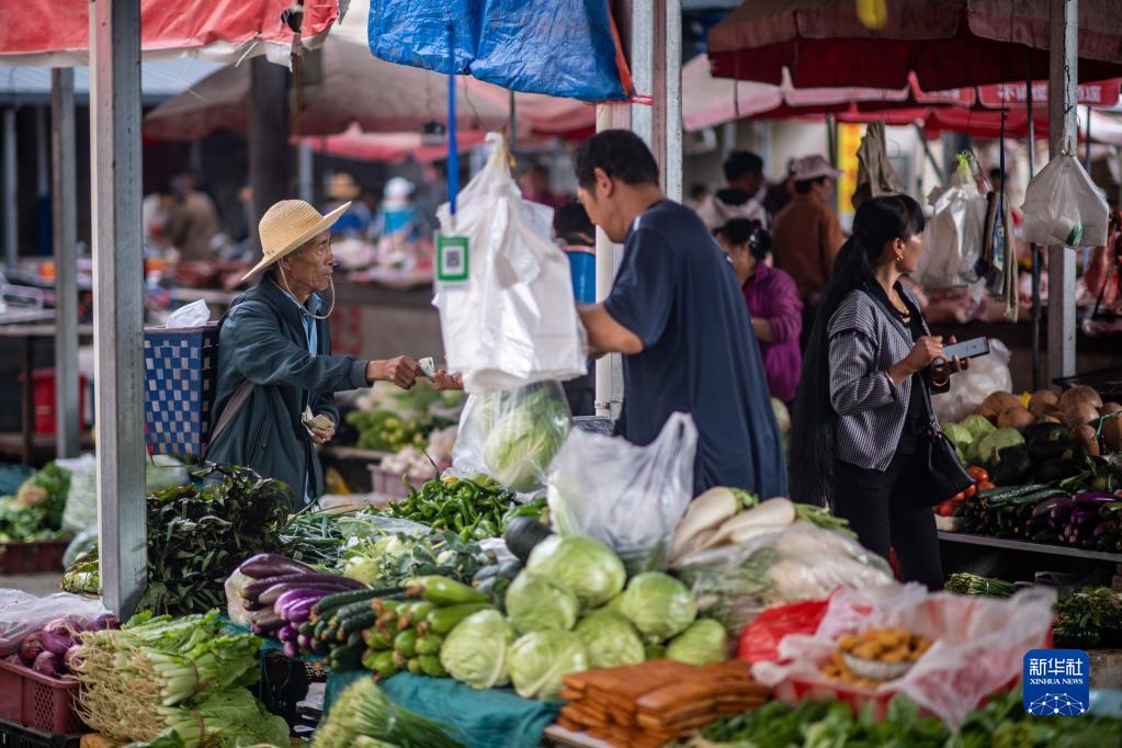 5月3日,村民在云南省保山市隆陽區瓦窯鎮集貿市場購買新鮮蔬菜。