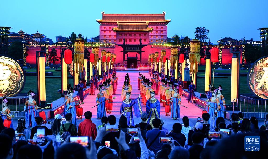 4月30日,游客在西安城墻景區觀看演出《夢長安——大唐迎賓盛禮》。