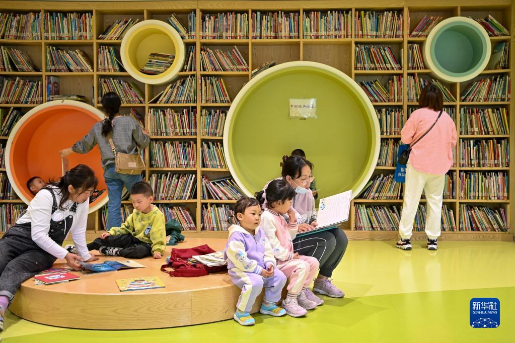 5月3日,家長和小朋友在太原市圖書館閱讀。