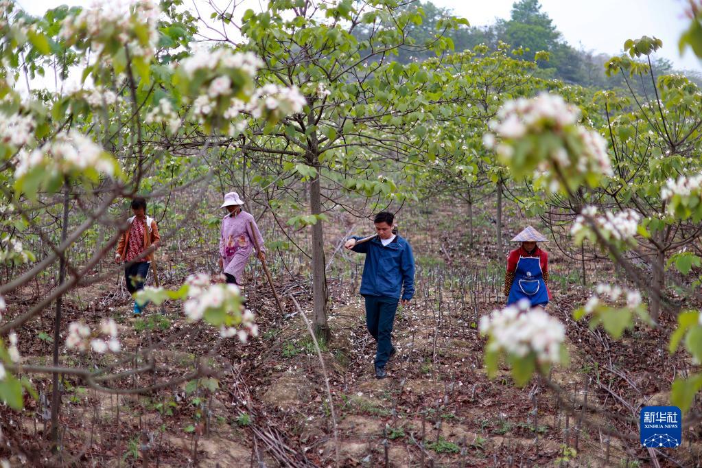 楊安仁(右二)和工人在油桐種植基地工作(4月17日攝)。