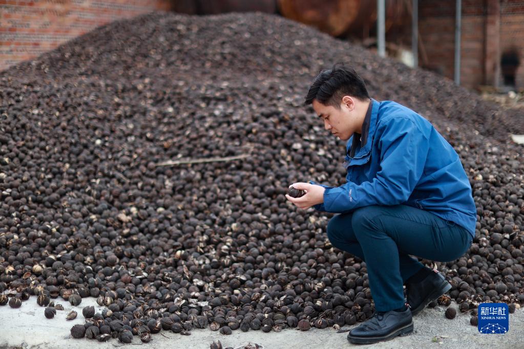 楊安仁檢查收獲的油桐果實(4月17日攝)。