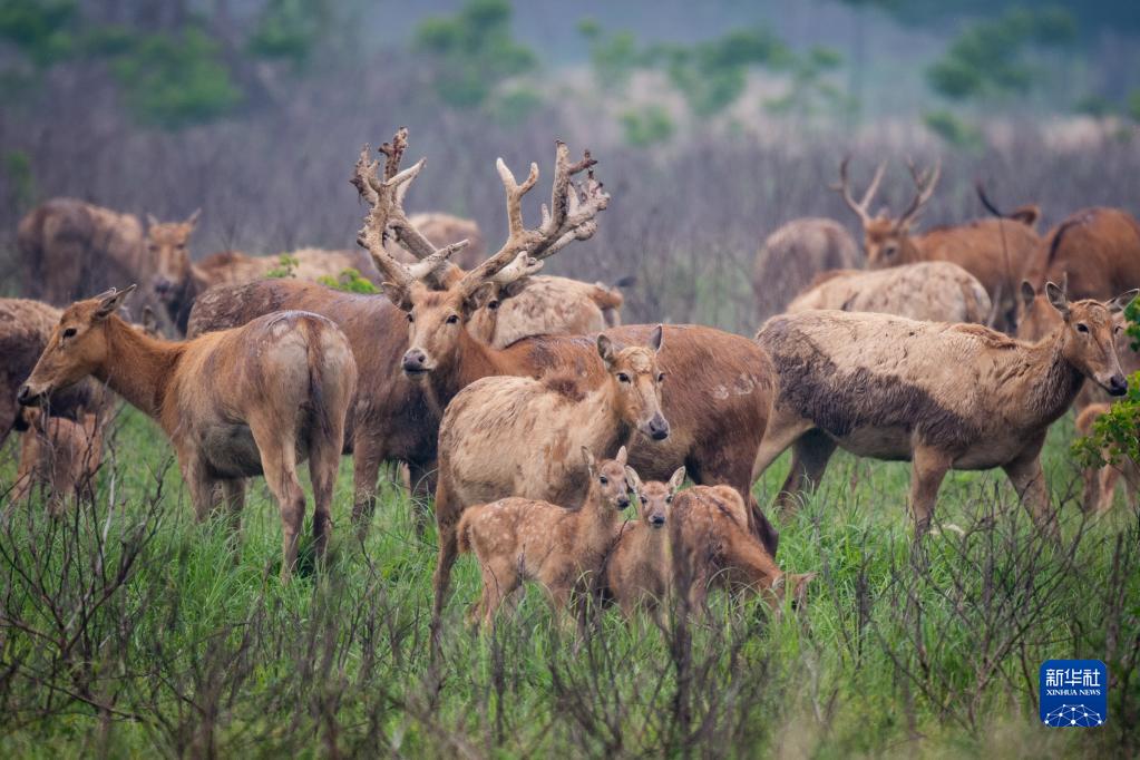 4月28日,一群麋鹿帶著幼鹿在石首麋鹿國家級自然保護區活動。