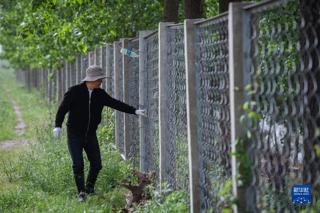 4月29日,巡護員王傳軍在石首麋鹿國家級自然保護區檢查鐵絲網。