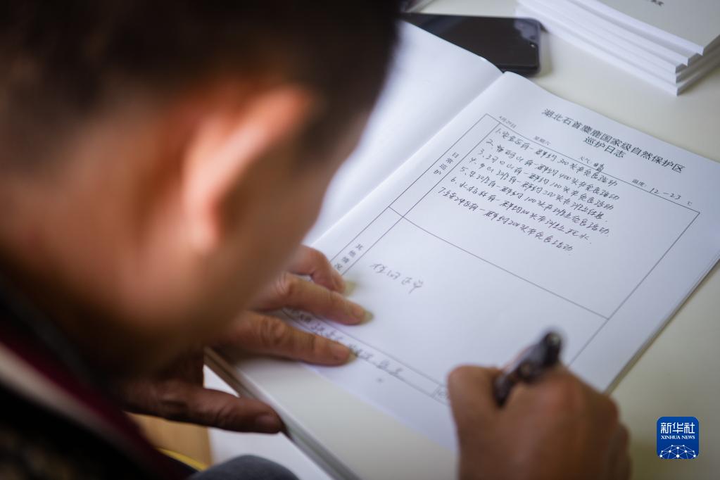 4月29日,在石首麋鹿國家級自然保護區,巡護員劉吉高填寫巡護日志。