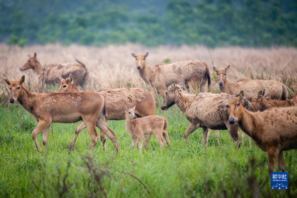 4月28日,一群麋鹿帶著幼鹿在石首麋鹿國家級自然保護區活動。孕期母鹿通常會選擇較為隱蔽的地方獨自待產。剛出生的幼鹿體格較弱,母鹿一般會獨自喂養約一周后再將其帶回鹿群。