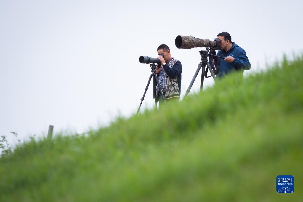 4月29日,在石首麋鹿國家級自然保護區,工程師張玉銘(右)和巡護員劉吉高在觀測遠處的麋鹿群。