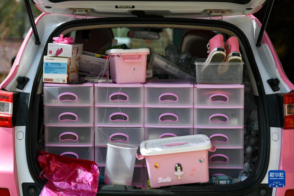 白婳的汽車后備箱裝滿藥箱(4月18日攝)。