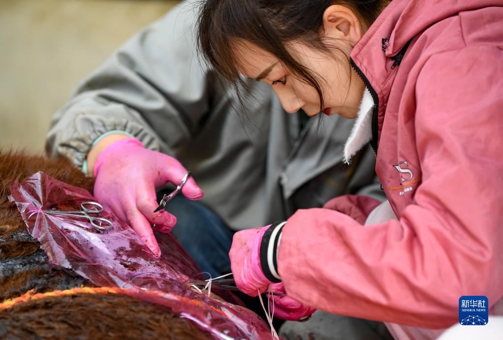 白婳在固原市原州區開城鎮雙泉村為村民李百武的一頭??p合傷口(4月18日攝)。