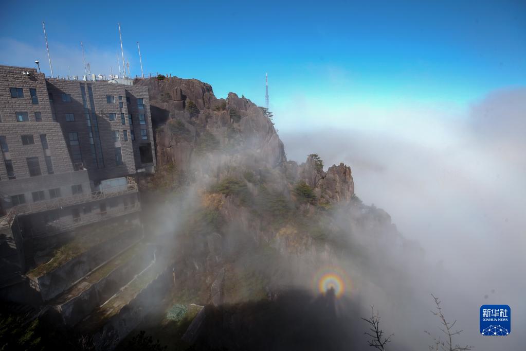 2022年11月23日,連續降雨過后,天空放晴,云海翻動,黃山光明頂出現“佛光”景象。