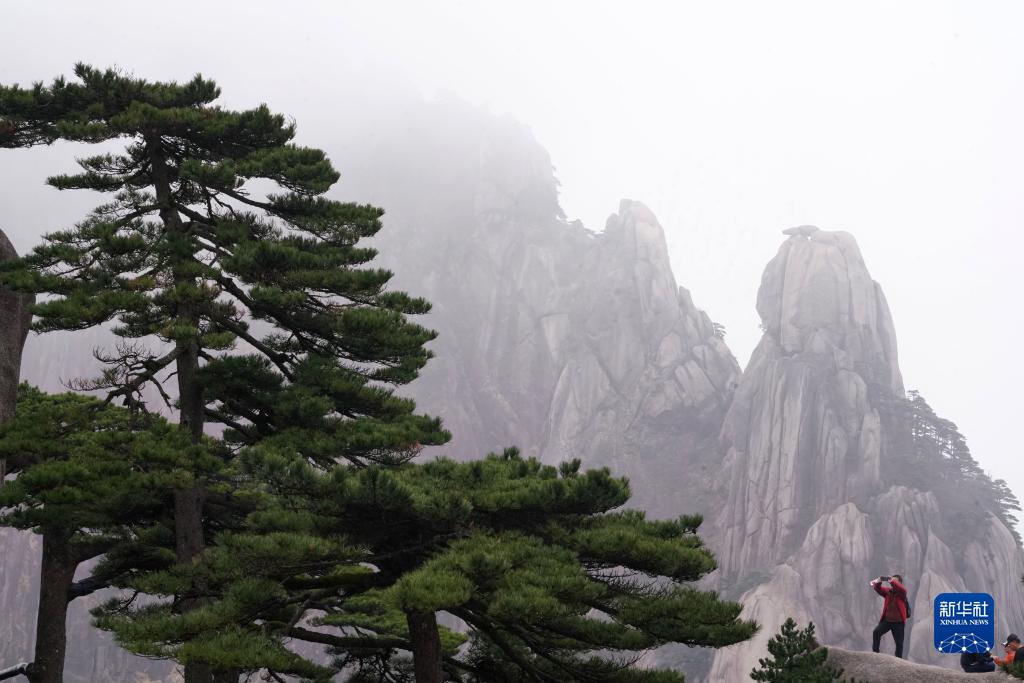 2023年4月11日,游客在拍攝黃山松。