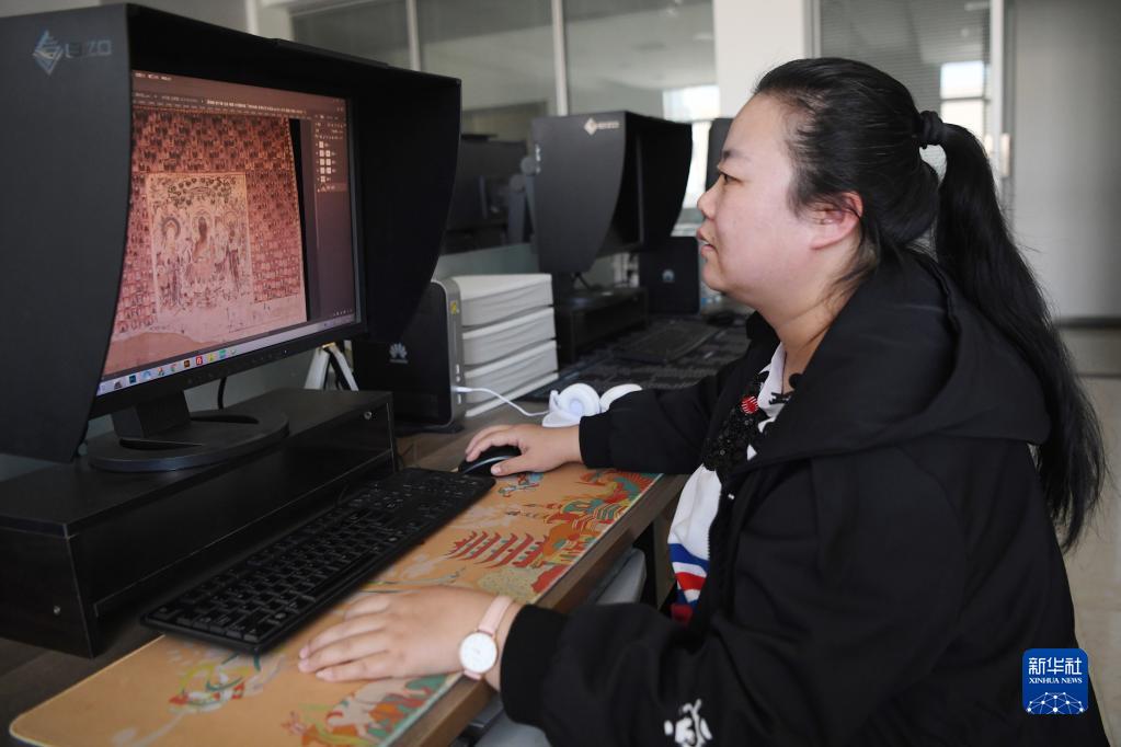 敦煌研究院文物數字化保護團隊圖像處理人員年海麗在拼接壁畫圖像(4月25日攝)。