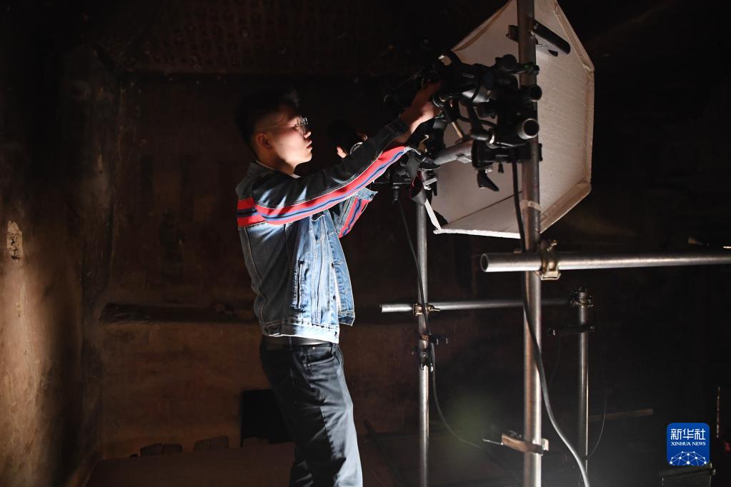 敦煌研究院文物數字化保護團隊圖像采集人員熊業騰在洞窟內調試設備,準備進行壁畫圖像采集(4月25日攝)。