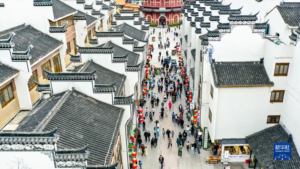 5月3日,游客在浙江省湖州市長興縣龍之夢太湖古鎮景區游玩(無人機照片)。