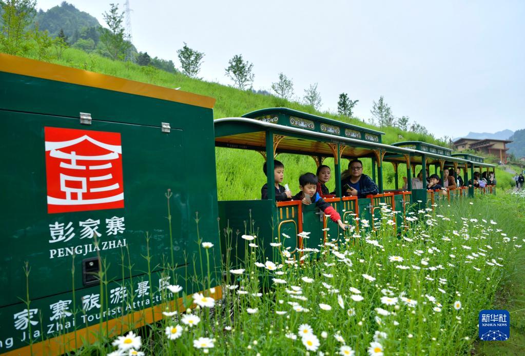 5月3日,游客在湖北省宣恩縣彭家寨古吊腳樓前體驗“小火車”。