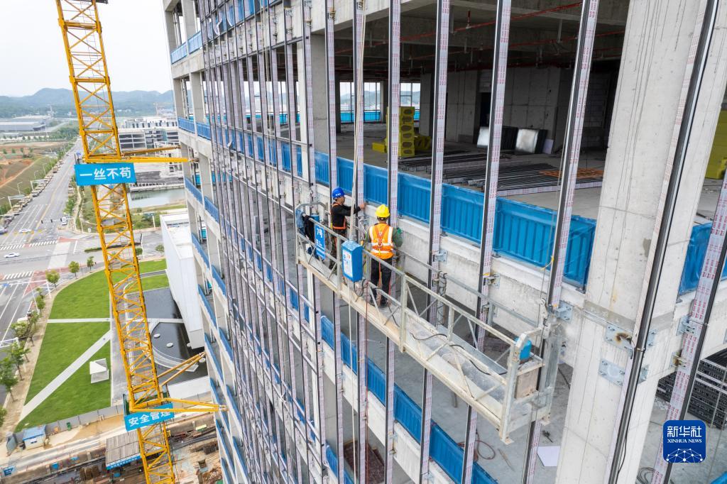 5月3日,工人在湖南長沙智谷項目建設工地為一棟高層建筑安裝幕墻(無人機照片)。