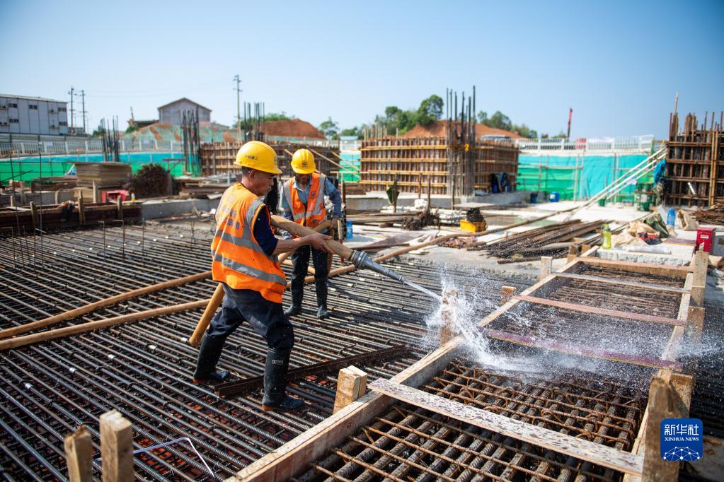 5月3日,在長沙西站建設工地,工人做混凝土澆筑前準備。