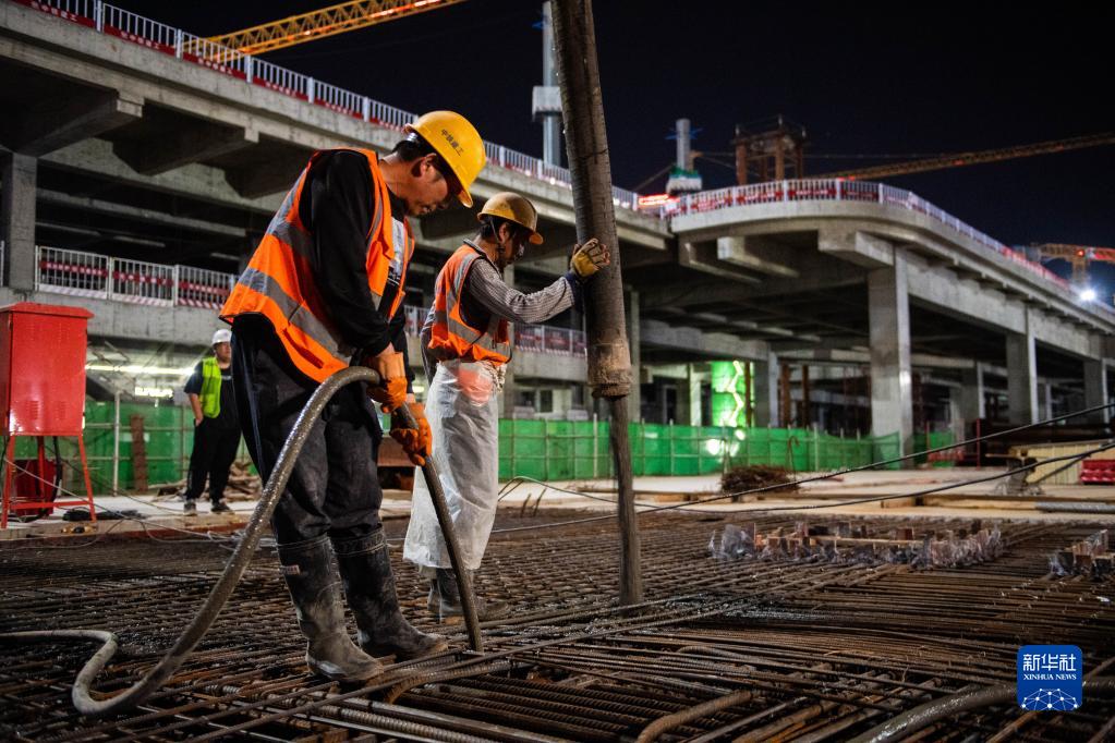 5月3日,在長沙西站建設工地,工人進行混凝土澆筑作業。