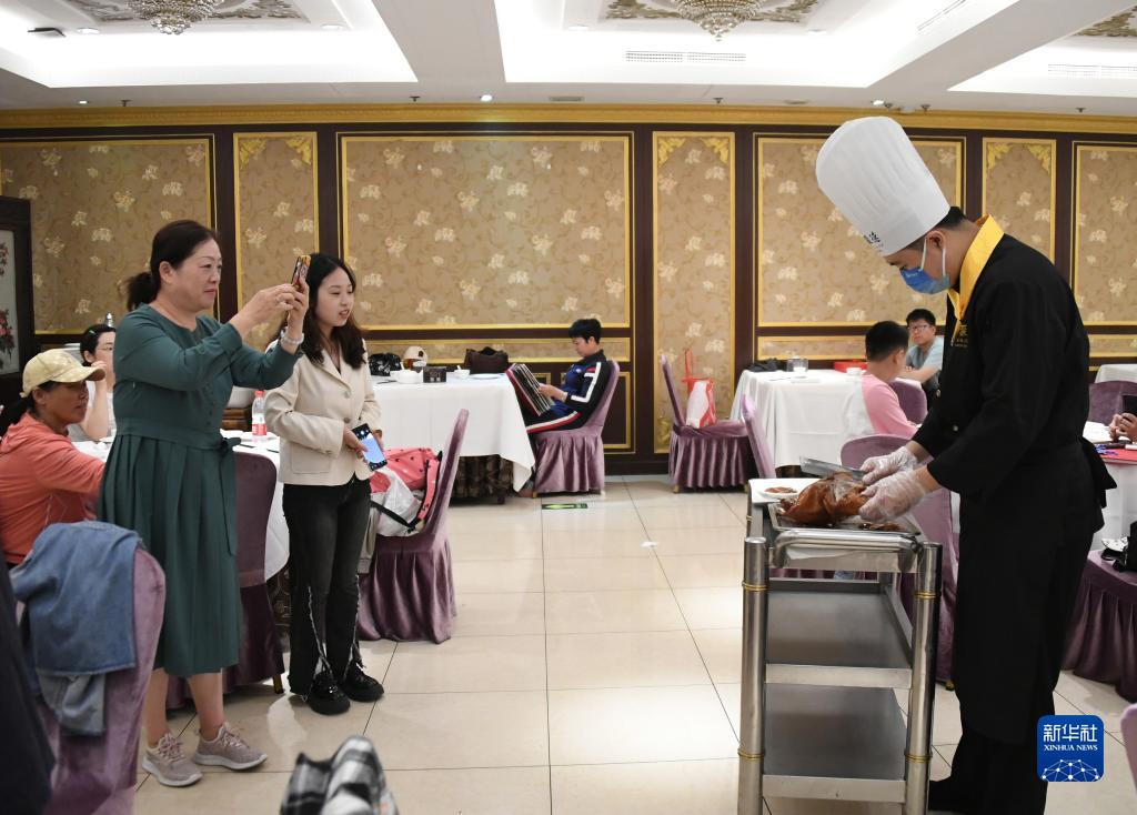 在全聚德王府井店,顧客拍攝夏志鵬(右一)片烤鴨(5月3日攝)。