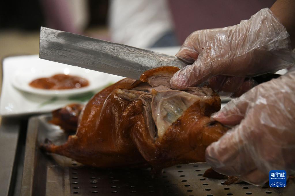 “五一”假期期間,在位于北京市東城區的全聚德王府井店,熱氣騰騰的烤鴨新鮮出爐,夏志鵬和其他烤鴨師熟練地片著烤鴨,吸引顧客拍照留念。