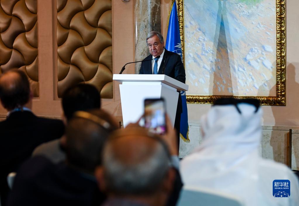 5月2日,聯合國秘書長古特雷斯在卡塔爾首都多哈發表講話。