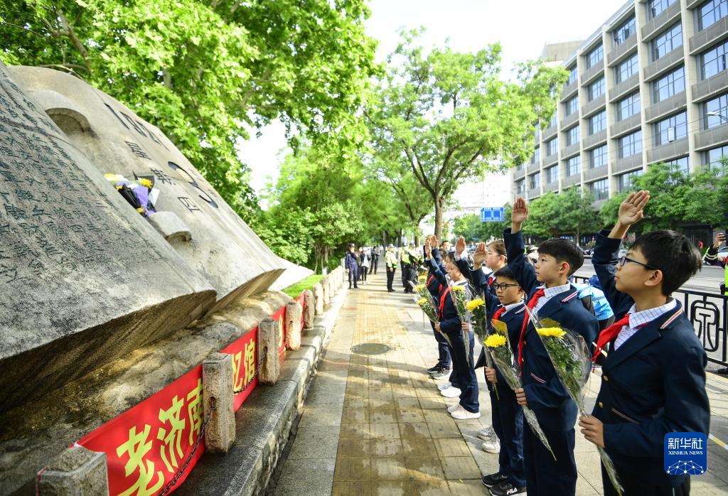 5月3日,小學生在“五三慘案”紀念碑前悼念。