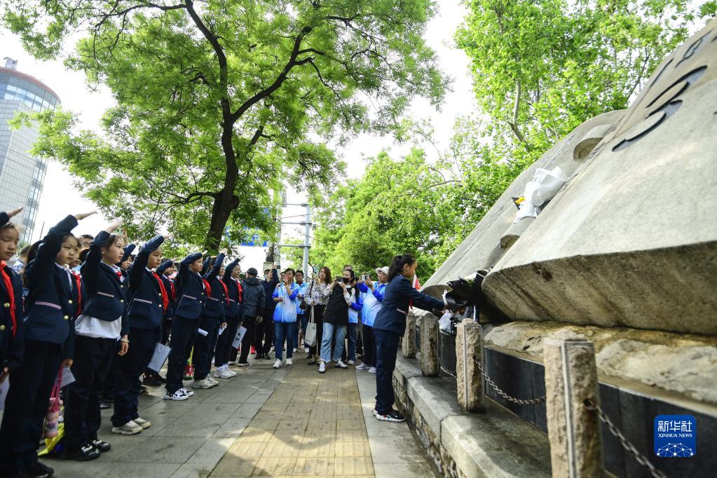 5月3日,小學生在“五三慘案”紀念碑前獻花。