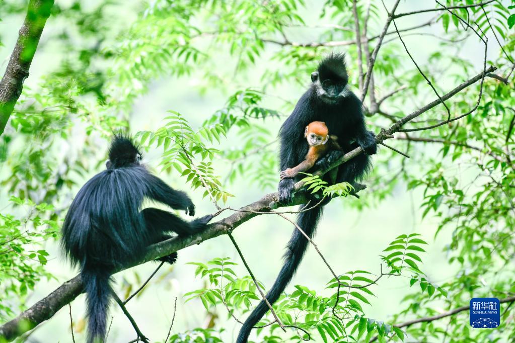 5月1日拍攝的貴州麻陽河國家級自然保護區的黑葉猴及幼猴。