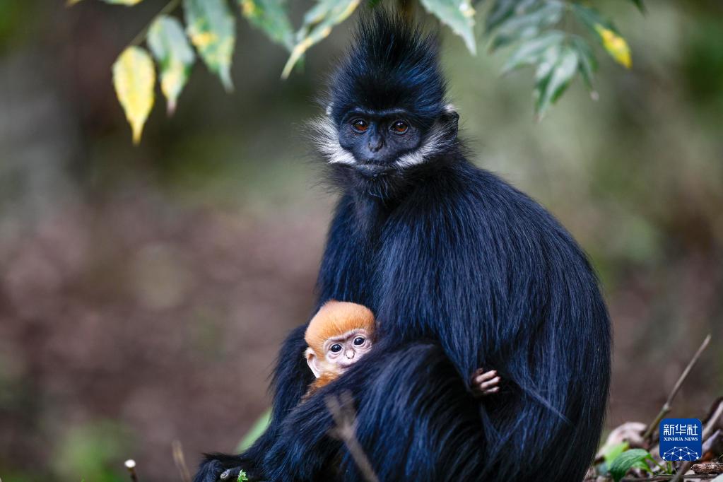 4月30日拍攝的貴州麻陽河國家級自然保護區的黑葉猴及幼猴。