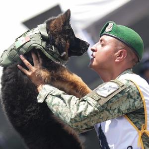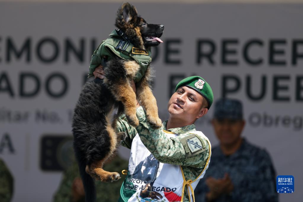 5月3日,在墨西哥瑙卡爾潘一處軍事基地,訓導員抱著土耳其贈送的小狗。