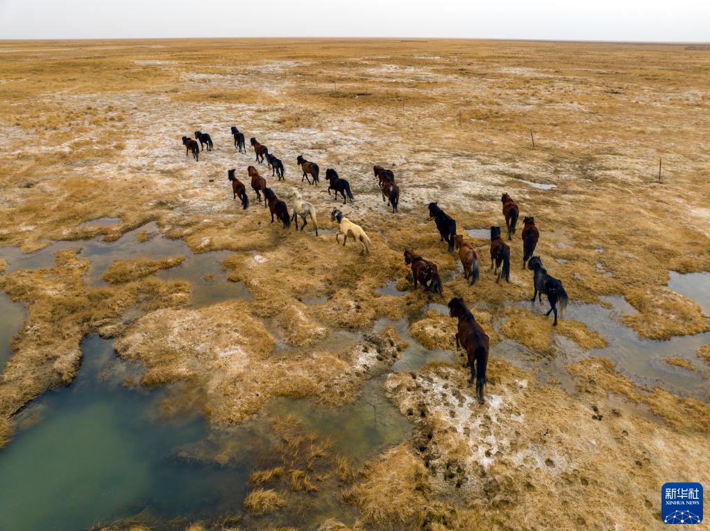 5月3日,在阿克塞縣阿伊納鄉海子草原,馬群轉場去往夏季牧場(無人機照片)。