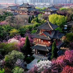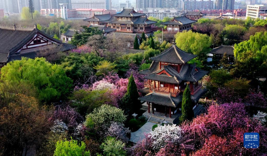 西安市青龍寺遺址景區內櫻花盛開(3月31日,無人機照片)。
