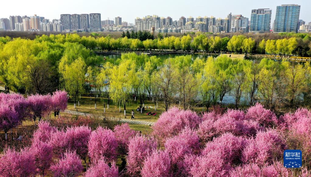 西安大明宮國家遺址公園內的美人梅連片盛開(3月14日攝,無人機照片)。