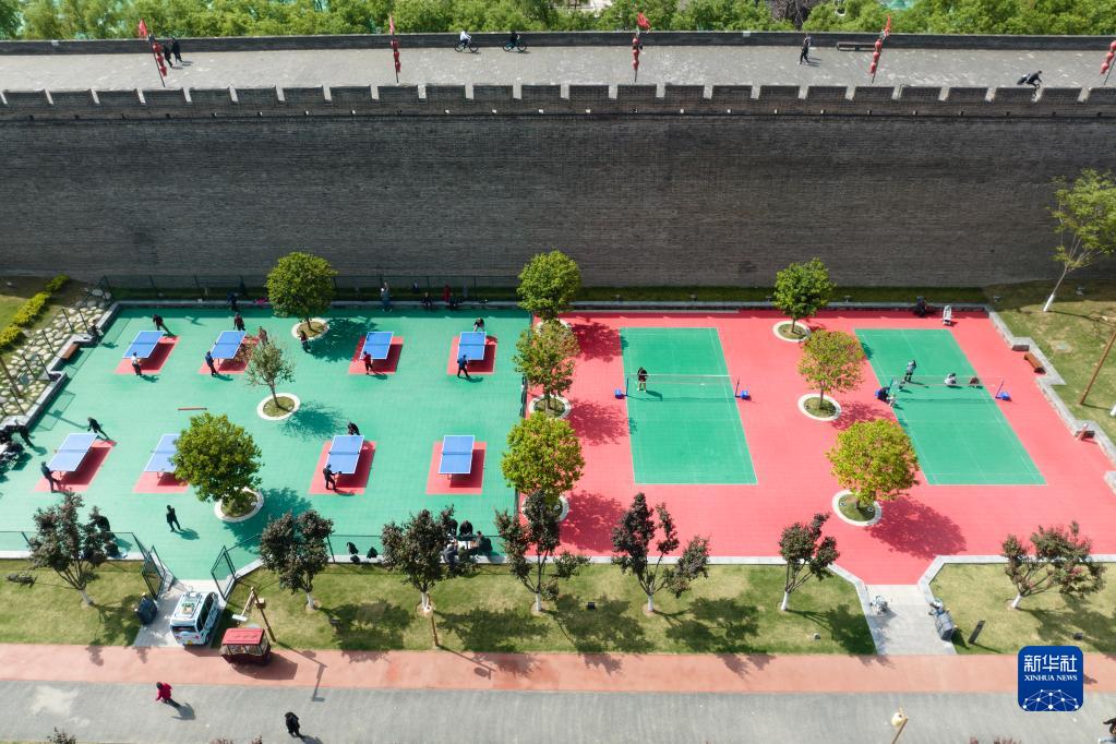 4月25日,市民游客在西安城墻北段外的公園內運動休閑(無人機照片)。