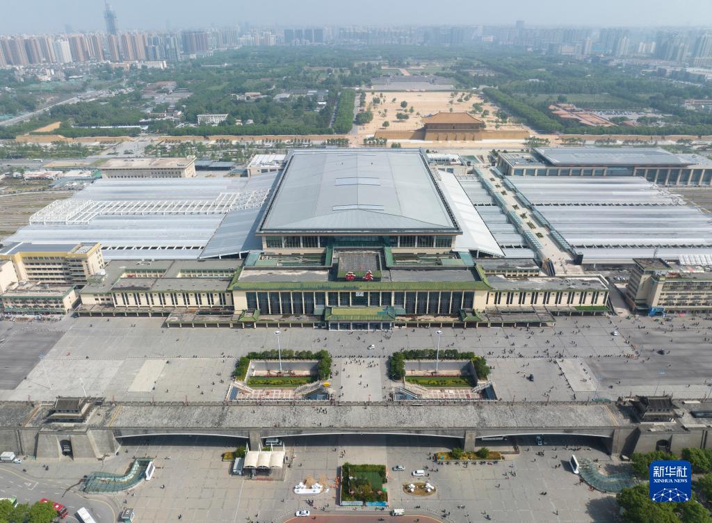 西安火車站與其身后的大明宮國家遺址公園(4月25日攝,無人機照片)。