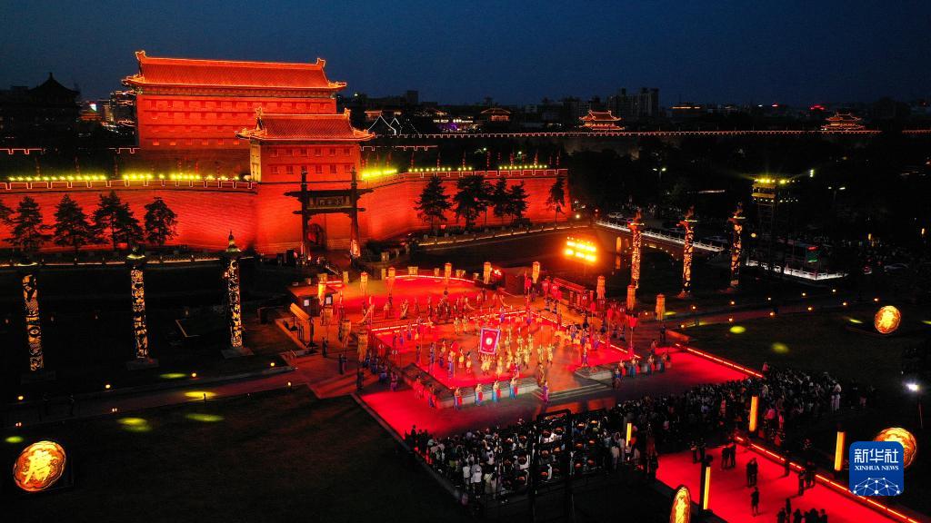 游客在西安城墻永寧門觀看《夢長安——大唐迎賓盛禮》(4月30日攝,無人機照片)。