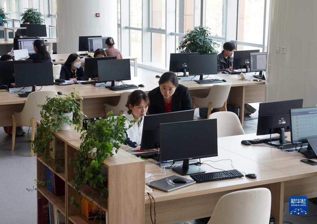 4月28日,在上海市檔案館的公眾查檔區,接待人員王琳元(中間站立者)在幫助市民查檔。