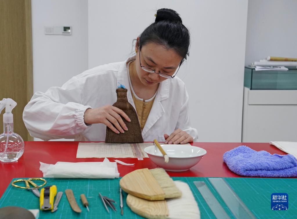 4月28日,在上海市檔案館的保護技術部,檔案修復師孟燁在修復歷史檔案。