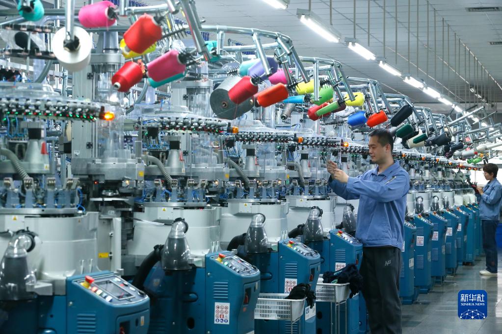 5月4日,在山東省青島市即墨區一家制襪企業,工人生產出口到海外市場的產品。