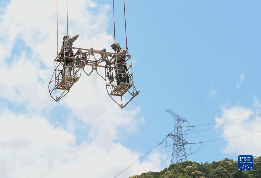 5月4日,在福建省寧德市洪口鄉,直升機將國網福建超高壓公司帶電班檢修工周曉剛(右)吊往檢修點開展輸電線路帶電檢修作業。