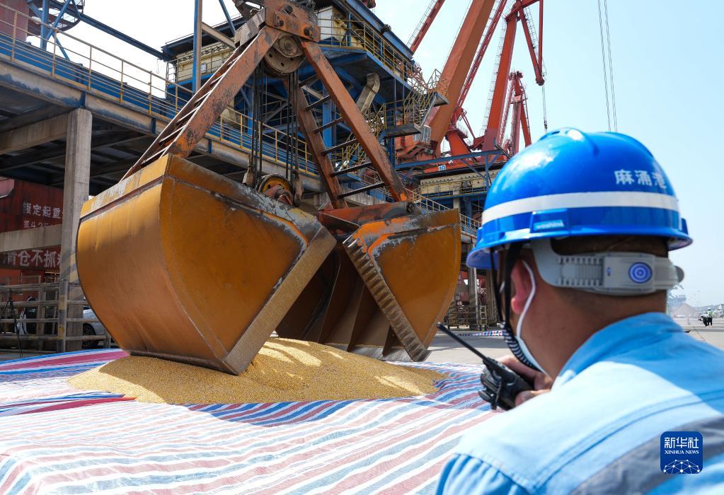 5月4日,首船進口南非飼料玉米抵達廣東麻涌港后,工作人員指揮吊機從船上卸下玉米接受檢驗檢疫。