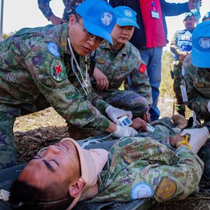 5月3日,在黎巴嫩南部邊境“藍線”附近雷場,參與演習的中國第21批赴黎巴嫩維和多功能工兵分隊醫療組對“傷員”傷情進行前期處置。