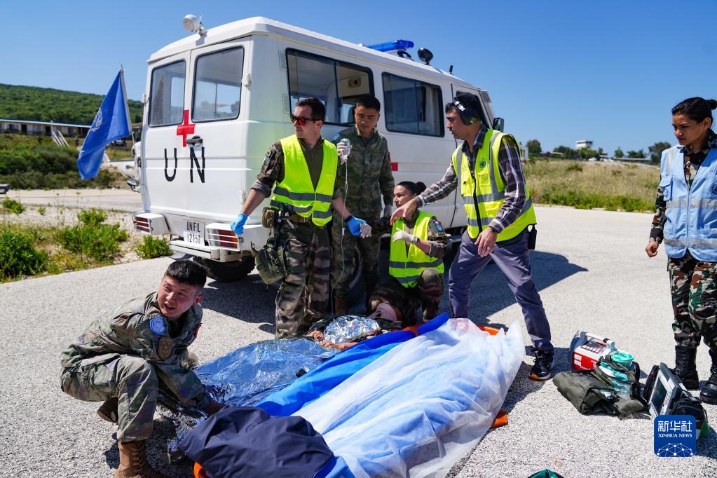 5月3日,在黎巴嫩南部邊境“藍線”附近雷場,參與演習的中國第21批赴黎巴嫩維和多功能工兵分隊隊員同外軍醫療分隊交接。新華社發(李竹林攝)