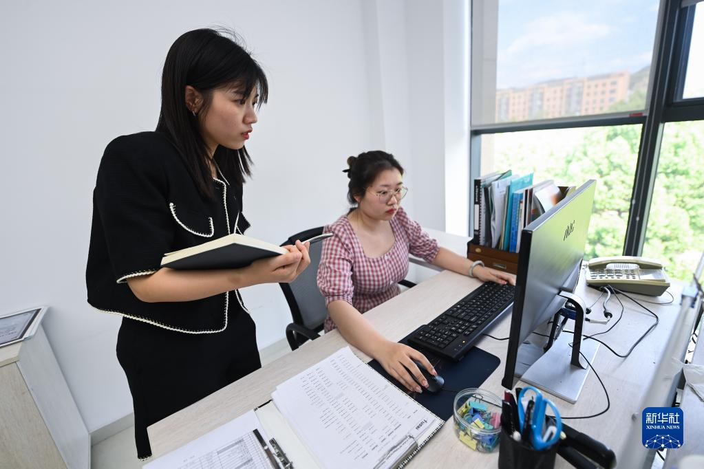 5月5日,諸暨市財政部門工作人員(左)在電腦前指導符合規定的外貿企業線上申請財政補助。