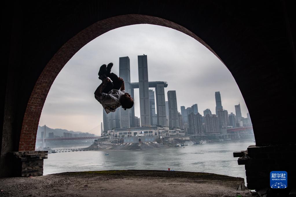 2023年4月21日,重慶躍飛跑酷隊員文舜堯在重慶朝天門對岸的南濱路上展示跑酷動作。